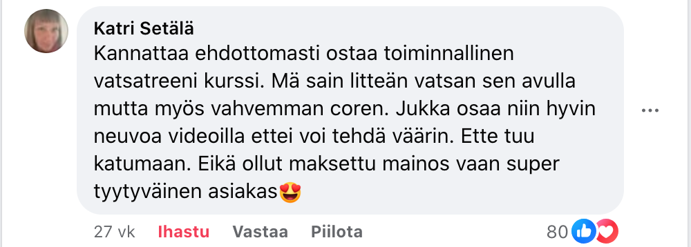 "Toiminnallinen vatsatreeni on hyvä koska se sisältää paljon tietoa uskottavassa muodossa ja siihen on helppo lähteä mukaan koska aluksi ei vaadita liikoja eikä aikaa tarvita kuin 15 minuuttia. Lopputuloksena on vahvat vatsalihakset. Liikkeitä on monipuolisesti ja ainakin itse opin paljon erilaisia tapoja vahvistaa vatsalihaksia. Hintakaan ei ole paha. Olen ollut tyytyväinen ja palaan aina säännöllisesti tavalla tai toisella kurssin harjoituksiin. Kiitos!"